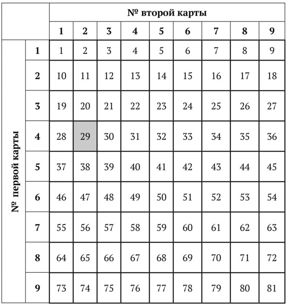 На пересечении первой линии под номером 4 (левый вертикальный столбец) и второй №2 (верхняя строка) мы находим нужную притчу. Это будет №29 (выделено в таблице цветом). Если не хочется искать постоянно данную таблицу, то нужно запомнить какие числа находятся в каждом ряду для первой карты. Для цифры 1 – это от 1 до 9; для 2 – от 10 до 18 и т. д. Для нашего примера с первой цифрой 4 мы знаем, что в этой линии находятся 9 притч – с 28 до 36. Вторая карта у нас 2. Первое число в этой линии – 28, второе – 29, значит, это и будет искомая притча.