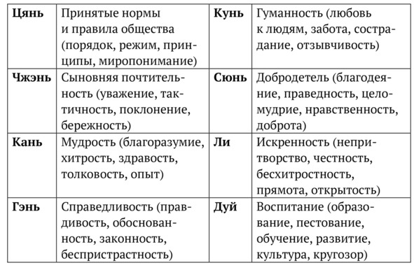 Помочь в вашем гадании смогут и советы дедушки Конфуция. Почему мы обратились еще и к нему? Когда мы стали гадать по «Книге Перемен» и пользоваться «Дао Дэ Цзин», то поняли, что еще не хватает некоторых аллегорий для получения законченной картинки. И моя жена «увидела» очень ярко образ: наше прочтение притч «Дао Дэ Цзин» – это как птица с одним крылом. Поэтому мы и решили обратиться к Конфуцию, т.к. для китайцев это два выдающихся мыслителя, которые находятся на одном уровне. Только Лао-цзы говорит о погружении в свой внутренний мир, чтобы постичь мироздание, а Конфуций дает советы о том, какие черты характера нужно в себе воспитывать, чтобы занимать достойную нишу в гармоничном обществе. Мы соотнесли постулаты последнего с триграммами и разместили их в таблице.