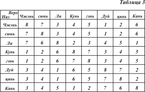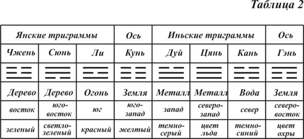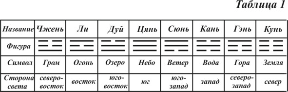 Когда китайцы уяснили для себя этот закон, они продолжили изыскания и пришли к триграммам. Это три линии (целые или прерывистые), расположенные одна над другой. Некоторые их характеристики приведены в таблице.