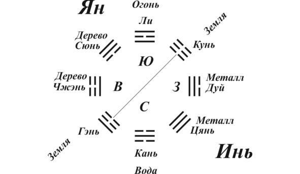 Но со временем китайцы пришли к пятиэлементной теории, и в связи с этим было решено изменить последовательность расположения триграмм ( Ей дали название «посленебесная» или «позднего Неба». Здесь уже фигуры расположились по другому принципу. Янские триграммы, относящиеся к Дереву и Огню, находятся выше и левее линии Земля-Земля, которая отделяет их от иньской части – Металла и Воды. Обе схемы мы расположили рядом, чтобы было наглядно видно, в чем отличие. рис. 2а).