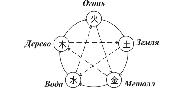 Для практики прорицания нам нужно разобраться с теорией «пяти первоэлементов (стихий/категорий)». На изображено их взаимодействие. Есть цикл порождения/поддерживания, который следует по часовой стрелке. Он еще рассматривается как отношения между матерью (предыдущим элементом) и сыном (последующим). Каждый элемент может выступать в роли матери и сына. Т. е., например, Дерево для Огня – мать, а для Воды является сыном. В цикле порождения от каждого элемента показана дуга со стрелкой (сплошная линия). Начнем с Дерева: Дерево – Огонь – Земля – Металл – Вода. И цикл угнетения/сдерживания – он расположен в виде звезды (прерывистая линия): Дерево – Земля – Вода – Огонь – Металл. рис. 3
