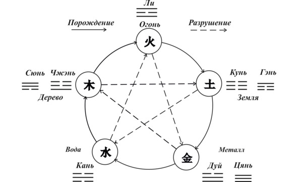 Рассмотрим процесс порождения, где каждый элемент создает следующему условия для существования: Дерево поддерживает процесс горения (Огонь). Во время горения образуется пепел, удобряющий Землю (точнее почву), либо несгоревшие вещества (труха от деревьев или травы), которые будут ее увеличивать (порождать). Кроме того, извержение вулкана – лава (продукт вулкана – Огня), стекая, также увеличивает площадь и объем поверхности Земли. В Земле зарождается Металл и прочный грунт, которые поддерживают или создают условия для Воды. И последняя операция в этом цикле – Вода поддерживает (питает) Дерево, здесь все понятно.