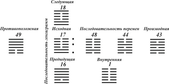 По горизонтали на рисунке показана картина перемен относительно нашего вопроса, а по вертикали – последовательность гексаграмм, т. е. где мы находились перед вопросом и будем после этих событий. Например, мы учимся в школе, и очередность дней (понедельник – 16, вторник – 17, среда – 18) – это последовательность гексаграмм, а что будет происходить конкретно во вторник – №17 на первом, четвертом и шестом – это череда событий на уроках и чем все закончится.
