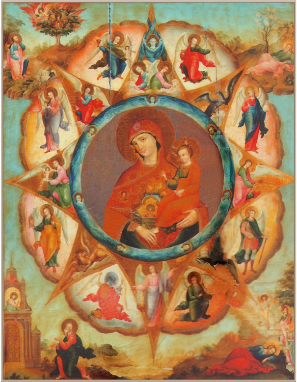В заключение этой характеристики остается упомянуть, что от иконописца не остается скрытым и самое прекрасное изо всех световых солнечных явлений – явление небесной радуги. В другом месте5 мне уже приходилось говорить о том, как в богородичных иконах новгородского письма мир, собранный во Христе вокруг Богоматери, являет собою как бы многоцветную радугу. Замечательное изображение этой радуги и удивительно глубокое понимание ее мистической сущности можно найти в иконах «Богородица – Неопалимая Купина», в особенности в замечательной иконе С. П. Рябушинского (псковского письма XV в.). Здесь как раз изображено преломление единого солнечного луча Божьего – в многоцветный спектр ангельских чинов, собравшихся вокруг Богоматери и через Нее властвующих над стихиями мира. В этом окружении каждый дух имеет свой особый цвет; но тот единый луч, с которым сочетается Богоматерь, тот огонь, который через Нее светит, объединяет в Ней всю эту духовную гамму небесного спектра: им горит в иконе весь многоцветный мир ангельский и человеческий. И, таким образом, Неопалимая Купина выражает собою идеал просветленной и прославленной твари, той твари, которая вмещает в себе огонь Божественного Слова и в нем горит, но не сгорает.