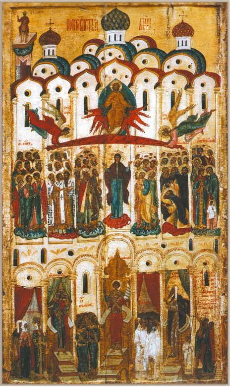 Такое евхаристическое понимание мира как грядущего тела Христова, мира, который в будущем веке должен стать тождественным с церковью, изображается во всем строении нашего храма и во всей его иконописи. Это – главная идея всей нашей церковной архитектуры и иконописи вообще; но высшего своего выражения это искусство достигает в XV и отчасти в XVI в., в котором все еще чувствуется духовный подъем великой творческой эпохи.
