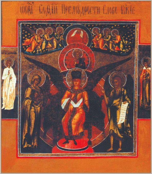 Посмотрите, как глубоко продумано это изображение15. «София» – предвечный замысел Божий о мире, та Мудрость, которою мир сотворен. Поэтому естественно сопоставить ее с предвечным изначальным Словом. Так оно и есть в иконе. В верхней части ее мы видим образ вечного Слова – Евангелие, окруженное ангелами; это комментарии на 1-й стих Евангелия Иоанна: в начале бе Слово; далее, под Евангелием, другое явление также Слова – Христос в солнечном сиянии Божественной славы, Христос, творящий согласно третьему стиху того же Евангелия: все произошло через Него и без Него не начало быть ничто, что произошло. Еще ниже, в непосредственном подчинении творящему Христу, София Премудрость на темном фоне ночного неба, усыпанного звездами. Что значит эта ночная темнота? Это – опять-таки ясное указание на стих Евангелия: И свет во тьме светит, и тьма не объяла его. А звезды, сияющие на небе, это огни, зажженные во тьме Премудростью, рассыпанные в ней искры Божьего света, миры, вызванные из мрака небытия ее творческим актом. Глядя на эту звездную ночь вокруг Софии, невольно вспоминаешь стих книги Голубиной: «Ночи темные – от дум Божиих». В другой лекции я имел случай объяснить, почему в иконе окрашены ярким пурпуром лик, руки и крылья св. Софии. То пурпур Божьей зари, занимающейся из мрака небытия; это – восход вечного солнца над тварью. София – то самое, что предшествует всем дням творения16, та сила, которая из ночного мрака рождает день; можно ли найти другой цвет, более для нее подходящий, нежели пурпур зари? Образы двух свидетелей Слова – Богоматери и Иоанна Крестителя – в иконе тоже напоминают о начале евангельского повествования.