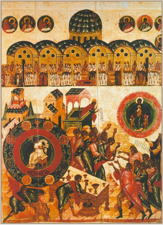 Возьмите любой иконостас классической эпохи новгородской иконописи, например иконостас в приделе Рождества Богородицы новгородского Софийского собора (XVI в.), и вы заметите в нем черту, резко отличающую все вообще древние православные храмы от современных. В нем над царскими вратами нет изображения Тайной вечери. Обычай изображать Тайную вечерю над царскими вратами составляет у нас довольно позднее и едва ли удачное новшество. В древних храмах вместо того над царскими вратами, а иногда в верхней части самих царских врат помещали изображение Евхаристии. Образ Христа писался тут вдвойне: с одной стороны он преподает апостолам хлеб, а с другой стороны – подносит им св. чашу.