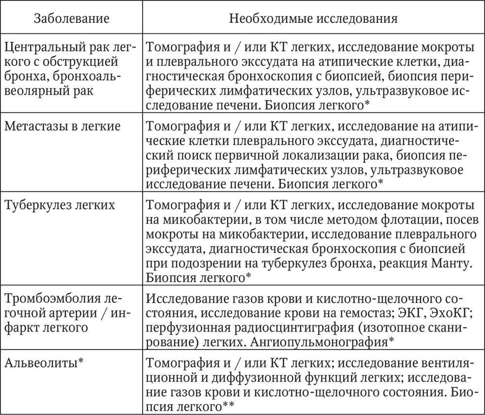 Дифференциальная диагностика пневмоний. Следует учитывать, что пневмония, плохо поддающаяся лечению, может оказаться туберкулезом легких (табл. 1), онкологическим (бронхогенный или бронхоальвеолярный рак, лимфома) или иммунологическим заболеванием (васкулиты, альвеолиты, эозинофильная пневмония, альвеолярный протеиноз), а также сердечно-сосудистой патологией (застойная сердечная недостаточность и тромбоэмболия легочной артерии).