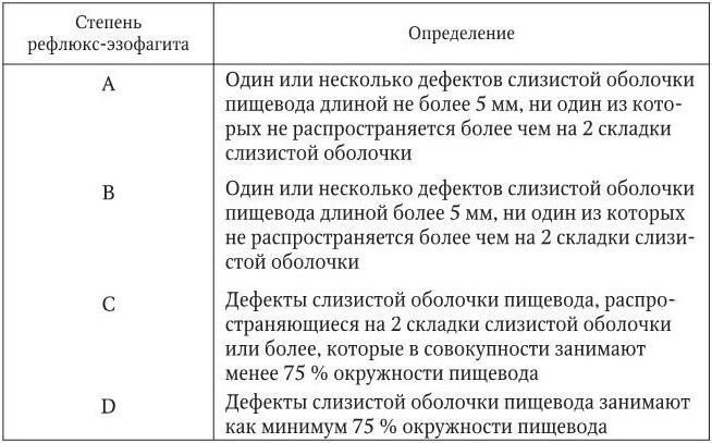 Эндоскопическая диагностика рефлюкс-эзофагита с нарушением целостности слизистой оболочки пищевода проводится согласно Лос-Анджелесской классификации 1994 г., при использовании которой в зависимости от объема поражения слизистой оболочки выделяют 4 степени рефлюкс-эзофагита (см. табл. 1).