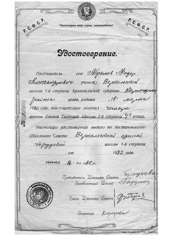 «Предъявитель сего Абрамов Фёдор Александрович, ученик Веркольской школы 1-й ступени Архангельской губернии Карпогорского района, родивш. 18 марта 1920 года, действительно окончил четыре группы Единой трудовой школы 1-й ступени 4-х летки.