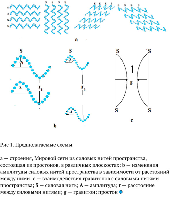 Пространство Вселенной в смоделированной системе представляет собой отрицательно заряженную Мировую «сеть» из силовых нитей пространства, равномерно напряженную во всех направлениях за счет сил отталкивания одноименных зарядов (Рис.1 a). Силовые нити пространства это волны. Скорость их колебания зависит от расстояний между ними, которые в свою очередь определяются физическими условиями среды их распространения. Наибольшее расстояние между ними (r0) находится в вакууме и составляет 10—18м. Амплитуда колебаний силовых нитей пространства пропорциональна расстоянию между ними. Чем меньше расстояние, тем больше амплитуда и наоборот (Рис.1. b).