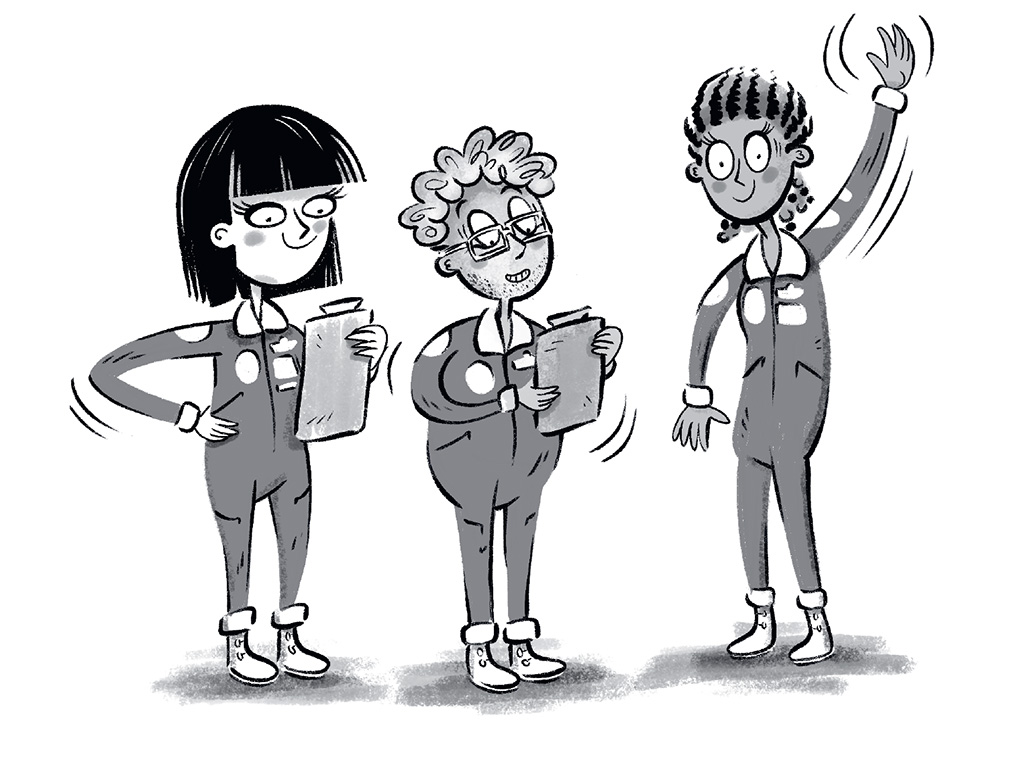‘Attention, space cadets!’ said a woman at the front with black hair that sat on her head like a helmet. ‘Attention and welcome to the winter session of Space Camp. We’re so glad everyone was able to join us. I’m Commander Margaret Liu, and these are my colleagues, Commander Wes Herman –’ she pointed at a short man next to her with curly hair like Bernard – ‘and Commander Sharon Hopper.’ A tall woman with lots of small braids smiled and waved at us. ‘We’ll be leading you on your missions this week here at Space Camp.’