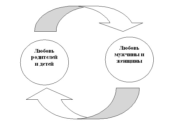 Эти два вида любви сопровождаются воздействием на тактильный анализатор и приятными физическими ощущениями. И эти два вида любви взаимосвязаны между собой. Одна любовь переходит в другую, образуется круговорот любви. Схематично это выглядит так: