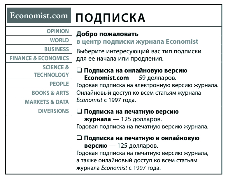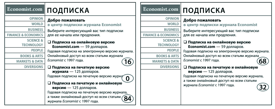 И еще один пример, взятый из книги профессора психологии и поведенческой экономики Дэна Ариели «Предсказуемая иррациональность», где он разбирает эффективность «подкрученного» рекламного объявления на сайте журнала Economist: