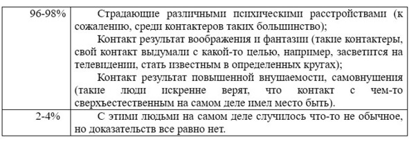 Теперь поговорим о моих исследованиях контактерства и каким выводам пришел я. Во-первых, я разработал два психологических теста «Особенности мистической личности» и «Метод черно-белых фигур» (тест на воображение, ассоциации, фантазии). По поводу самих контактеров, могу сказать, что все же не все они сумасшедшие, 3—4% на самом деле случилось что-то не известное и не понятное, однако проблема заключается в том, что эти люди не очень хотят афишировать, то что с ними случилось, ну по разным причинам. Не каждый человек захочет, чтобы его как подопытную мышку исследовали в лаборатории, капались в его психики комиссия из психиатров, психологов и других специалистов, однако я не устою повторять, что исследование контактантов должно проводиться комплексно и разными специалистами в разных сферах. Я сделал примерную процентную разбивку какие бывают контактеры, у меня получилось следующее: