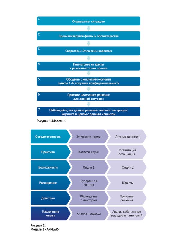 Модель 2 «APPEAR» предлагает пошаговый процесс, который поощряет коучей создавать собственные этические «антенны», чтобы научиться распознавать ситуации, которые требуют этических решений, осознавать последствия и находить наилучшие способы решения этих проблем. Эта модель нелинейная. Коуч в любой момент может вернуться в любую точку этой модели и снова проанализировать весь процесс.