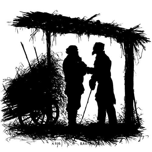 Лёгкий порыв ветерка разбудил меня… Я открыл глаза и увидел Калиныча: он сидел на пороге полураскрытой двери и ножом вырезывал ложку. Я долго любовался его лицом, кротким и ясным, как вечернее небо. Г-н Полутыкин тоже проснулся. Мы не тотчас встали. Приятно после долгой ходьбы и глубокого сна лежать неподвижно на сене: тело нежится и томится, лёгким жаром пышет лицо, сладкая лень смыкает глаза. Наконец мы встали и опять пошли бродить до вечера. За ужином я заговорил опять о Хоре да о Калиныче.