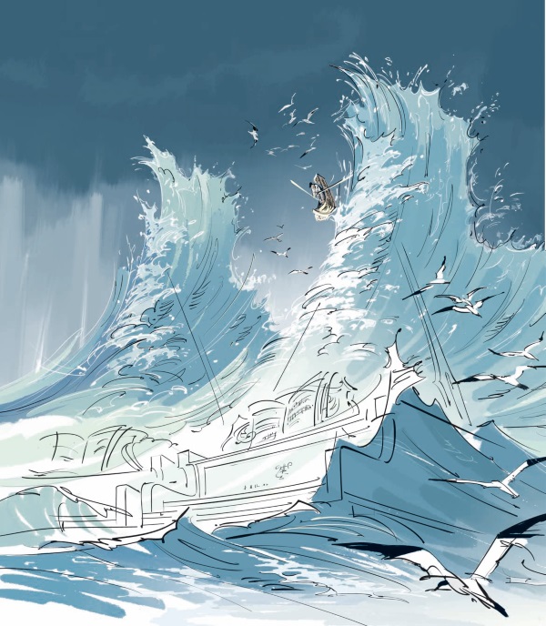 Только сейчас Антошка увидел не разгар бури, как на картине, а когда буря только начиналась. И как человек изо всех сил пытался уплыть от бури туда, где на горизонте ещё светило солнце. Но за его спиной уже закипало море, вспыхивали молнии, гремел гром, и вот уже чёрные тучи заклубились над самой головой человека. Всё же он не останавливал бег лодочки, то поднимаясь на волну, то обрушиваясь вниз, в холодную страшную яму, в которой отражались молнии. Но силы были слишком неравные. И вот вокруг человека поднялись, как скалы, громадные волны, неистовый ветер затрепал, закружил лодочку..