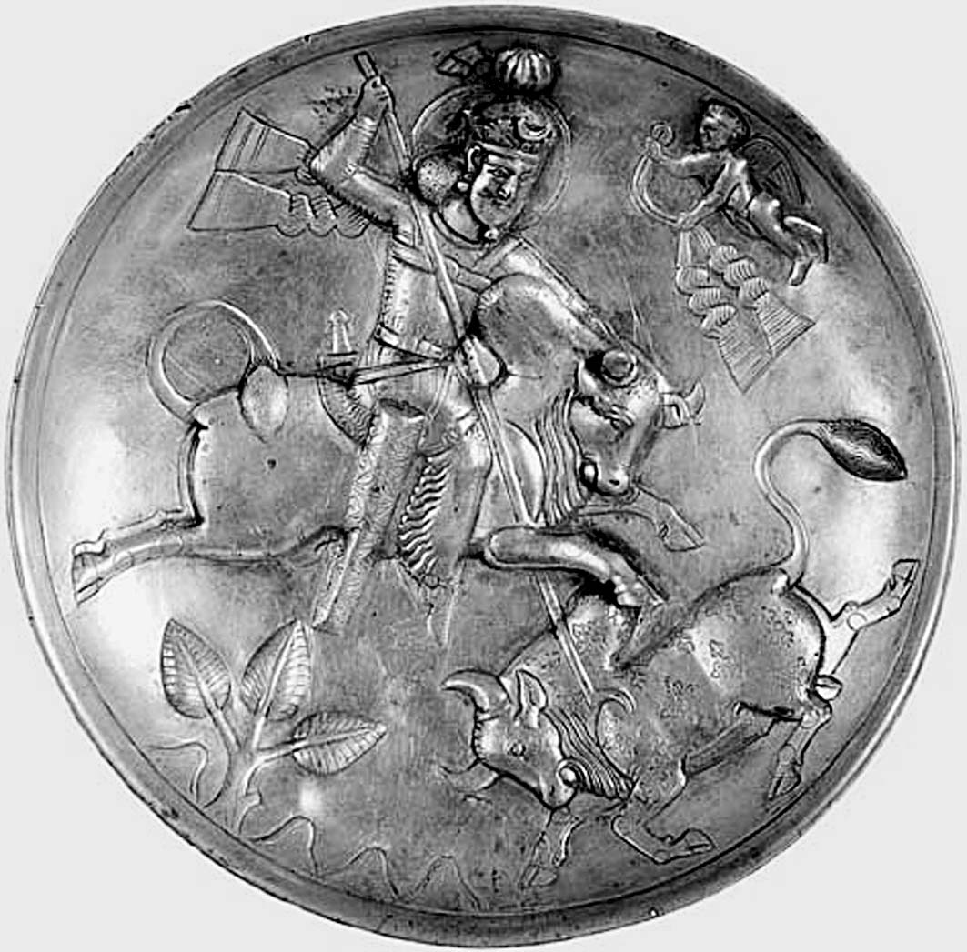 Серебряное блюдо с традиционным рисунком (охота на тура).