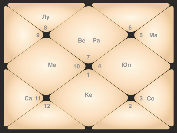 У каждой планеты есть свои знаки: так вот у Юпитера два знака – это девятый Стрелец и двенадцатый знак Рыбы. Есть дома, в которых планеты чувствуют себя либо хорошо, либо плохо, так же есть дома, которыми планеты управляют. Например, в карте (Рисунок 1) девятый знак, которым управляет Юпитер – это Стрелец, он располагается в третьем доме (стоит напомнить, что счет идет от лагны против часовой стрелки). Лагна Весы (7) является первым домом. В третьем доме располагается девятый знак – Стрелец. Юпитер, в данном случае, управляет третьим домом – домом собственных усилий, младших братьев и сестер, а также возможностей человека в общем (то, как он может справляться с чем-либо, бороться и справляться со своими собственными желаниями). Также Юпитер управляет 6-м домом – домом служения, врагов, долгов, препятствий. Если посмотреть на эту карту, то здесь Юпитер в десятом доме, а это как раз дом карьеры, кармы, реализации своего социального предназначения.