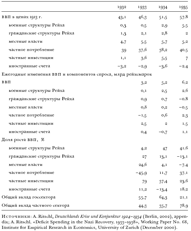 Несомненно то, что и в 1933, и в 1934 г. полным ходом шло «естественное» выздоровление германского делового сектора. В 1933 г. важнейшей движущей силой восстановления служили инвестиции – главным образом в наращивание основного капитала. Первые признаки этого подъема стали основой для странной волны оптимизма, охватившей Веймарскую республику незадолго до ее кончины[201]. После 1933 г. государственная политика оставила такой глубокий отпечаток на эволюции экономики, что все разговоры о продолжении «естественного выздоровления» становятся в какой-то степени спекулятивными. Мы не можем знать хотя бы с минимальной уверенностью, что произошло бы в том случае, если бы у власти находилось другое правительство.