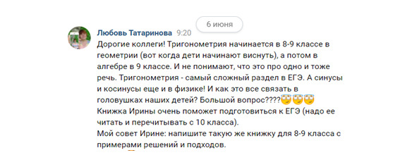 Написав книгу «Тригонометрия – это просто!» для учащихся 10—11 классов, обнаружила, что непонимание, а значит, и непринятие закладывается гораздо раньше, при изучении геометрии в 8 классе, при первом знакомстве. И здесь выражаю благодарность Любови Григорьевне Татариновой, учителю физики с многолетним стажем. Именно она посоветовала мне написать книгу и для ребят 8—9 классов: