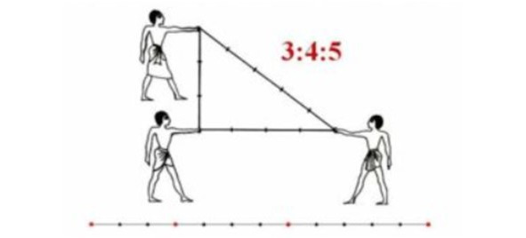Как вы понимаете, в пространстве сложно отложить прямой угол, (в природе и так редко встретишь прямые линии, а уж тем более прямые углы), но египтяне изобрели интересный способ. Они брали веревку, отмеряли на ней узелками 12 частей, а потом складывали из нее треугольник, стороны которого равны 3, 4 и 5 частям соответственно. В этом треугольнике прямой угол получался сам собой! Имея такой инструмент, они могли с большой точностью строить свои сооружения, например, пирамиды. А также использовать его для разметки земли под сельскохозяйственные работы.