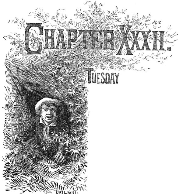 The alarm swept from lip to lip, from group to group, from street to street, and within five minutes the bells were wildly clanging and the whole town was up! The Cardiff Hill episode sank into instant insignificance, the burglars were forgotten, horses were saddled, skiffs were manned, the ferry-boat ordered out, and before the horror was half an hour old, two hundred men were pouring down high-road and river toward the cave.