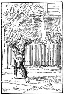 He worshipped this new angel with furtive eye, till he saw that she had discovered him; then he pretended he did not know she was present, and began to “show off” in all sorts of absurd boyish ways, in order to win her admiration. He kept up this grotesque foolishness for some time; but by and by, while he was in the midst of some dangerous gymnastic performances, he glanced aside and saw that the little girl was wending her way toward the house. Tom came up to the fence and leaned on it, grieving, and hoping she would tarry yet a while longer. She halted a moment on the steps and then moved toward the door. Tom heaved a great sigh as she put her foot on the threshold. But his face lit up, right away, for she tossed a pansy over the fence a moment before she disappeared.