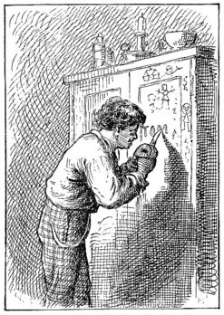 Tom was a trifle disconcerted. The basin was refilled, and this time he stood over it a little while, gathering resolution; took in a big breath and began. When he entered the kitchen presently, with both eyes shut and groping for the towel with his hands, an honorable testimony of suds and water was dripping from his face. But when he emerged from the towel, he was not yet satisfactory, for the clean territory stopped short at his chin and his jaws, like a mask; below and beyond this line there was a dark expanse of unirrigated soil that spread downward in front and backward around his neck. Mary took him in hand, and when she was done with him he was a man and a brother, without distinction of color, and his saturated hair was neatly brushed, and its short curls wrought into a dainty and symmetrical general effect. [He privately smoothed out the curls, with labor and difficulty, and plastered his hair close down to his head; for he held curls to be effeminate, and his own filled his life with bitterness.] Then Mary got out a suit of his clothing that had been used only on Sundays during two years – they were simply called his “other clothes” – and so by that we know the size of his wardrobe. The girl “put him to rights” after he had dressed himself; she buttoned his neat roundabout up to his chin, turned his vast shirt collar down over his shoulders, brushed him off and crowned him with his speckled straw hat. He now looked exceedingly improved and uncomfortable. He was fully as uncomfortable as he looked; for there was a restraint about whole clothes and cleanliness that galled him. He hoped that Mary would forget his shoes, but the hope was blighted; she coated them thoroughly with tallow, as was the custom, and brought them out. He lost his temper and said he was always being made to do everything he didn’t want to do. But Mary said, persuasively: