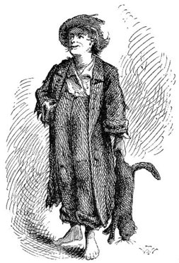 Shortly Tom came upon the juvenile pariah of the village, Huckleberry Finn, son of the town drunkard. Huckleberry was cordially hated and dreaded by all the mothers of the town, because he was idle and lawless and vulgar and bad – and because all their children admired him so, and delighted in his forbidden society, and wished they dared to be like him. Tom was like the rest of the respectable boys, in that he envied Huckleberry his gaudy outcast condition, and was under strict orders not to play with him. So he played with him every time he got a chance. Huckleberry was always dressed in the cast-off clothes of full-grown men, and they were in perennial bloom and fluttering with rags. His hat was a vast ruin with a wide crescent lopped out of its brim; his coat, when he wore one, hung nearly to his heels and had the rearward buttons far down the back; but one suspender supported his trousers; the seat of the trousers bagged low and contained nothing, the fringed legs dragged in the dirt when not rolled up.