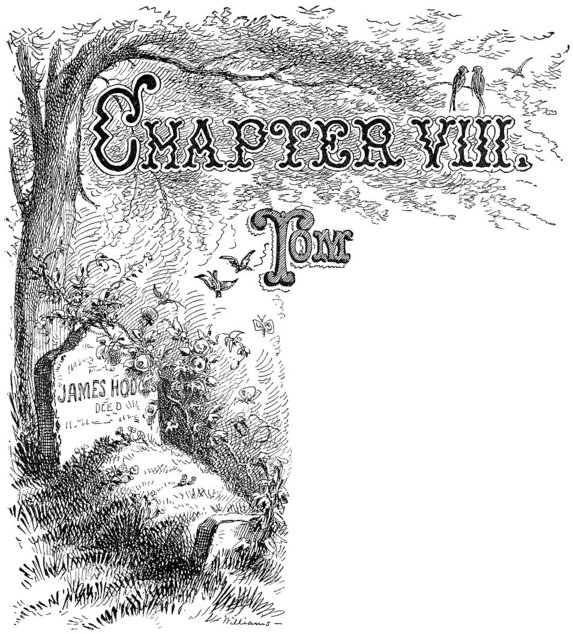 It was a graveyard of the old-fashioned Western kind. It was on a hill, about a mile and a half from the village. It had a crazy board fence around it, which leaned inward in places, and outward the rest of the time, but stood upright nowhere. Grass and weeds grew rank over the whole cemetery. All the old graves were sunken in, there was not a tombstone on the place; round-topped, worm-eaten boards staggered over the graves, leaning for support and finding none. “Sacred to the memory of” So-and-So had been painted on them once, but it could no longer have been read, on the most of them, now, even if there had been light.
