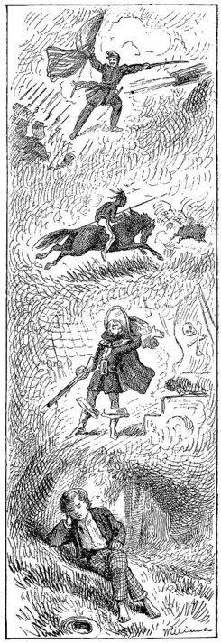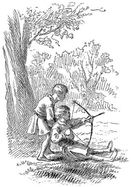 This was satisfactory, and so these adventures were carried out. Then Tom became Robin Hood again, and was allowed by the treacherous nun to bleed his strength away through his neglected wound. And at last Joe, representing a whole tribe of weeping outlaws, dragged him sadly forth, gave his bow into his feeble hands, and Tom said, “Where this arrow falls, there bury poor Robin Hood under the greenwood tree.” Then he shot the arrow and fell back and would have died, but he lit on a nettle and sprang up too gaily for a corpse.