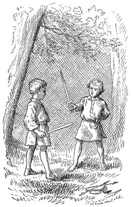 They took their lath swords, dumped their other traps on the ground, struck a fencing attitude, foot to foot, and began a grave, careful combat, “two up and two down.” Presently Tom said: