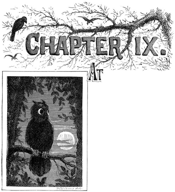half-past nine, that night, Tom and Sid were sent to bed, as usual. They said their prayers, and Sid was soon asleep. Tom lay awake and waited, in restless impatience. When it seemed to him that it must be nearly daylight, he heard the clock strike ten! This was despair. He would have tossed and fidgeted, as his nerves demanded, but he was afraid he might wake Sid. So he lay still, and stared up into the dark. Everything was dismally still. By and by, out of the stillness, little, scarcely perceptible noises began to emphasize themselves. The ticking of the clock began to bring itself into notice. Old beams began to crack mysteriously. The stairs creaked faintly. Evidently spirits were abroad. A measured, muffled snore issued from Aunt Polly’s chamber. And now the tiresome chirping of a cricket that no human ingenuity could locate, began. Next the ghastly ticking of a death-watch in the wall at the bed’s head made Tom shudder – it meant that somebody’s days were numbered. Then the howl of a far-off dog rose on the night air, and was answered by a fainter howl from a remoter distance. Tom was in an agony. At last he was satisfied that time had ceased and eternity begun; he began to doze, in spite of himself; the clock chimed eleven, but he did not hear it. And then there came, mingling with his half-formed dreams, a most melancholy caterwauling. The raising of a neighboring window disturbed him. A cry of “Scat! you devil!” and the crash of an empty bottle against the back of his aunt’s wood-shed brought him wide awake, and a single minute later he was dressed and out of the window and creeping along the roof of the “ell” on all fours. He “meow’d” with caution once or twice, as he went; then jumped to the roof of the wood-shed and thence to the ground. Huckleberry Finn was there, with his dead cat. The boys moved off and disappeared in the gloom. At the end of half an hour they were wading through the tall grass of the graveyard.