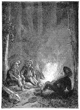 They built a fire against the side of a great log twenty or thirty steps within the sombre depths of the forest, and then cooked some bacon in the frying-pan for supper, and used up half of the corn “pone” stock they had brought. It seemed glorious sport to be feasting in that wild, free way in the virgin forest of an unexplored and uninhabited island, far from the haunts of men, and they said they never would return to civilization. The climbing fire lit up their faces and threw its ruddy glare upon the pillared tree-trunks of their forest temple, and upon the varnished foliage and festooning vines.