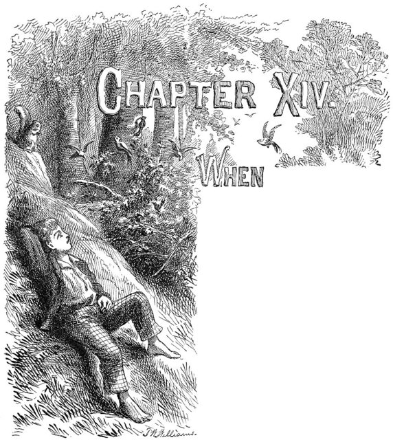 Now, far away in the woods a bird called; another answered; presently the hammering of a woodpecker was heard. Gradually the cool dim gray of the morning whitened, and as gradually sounds multiplied and life manifested itself. The marvel of Nature shaking off sleep and going to work unfolded itself to the musing boy. A little green worm came crawling over a dewy leaf, lifting two-thirds of his body into the air from time to time and “sniffing around,” then proceeding again – for he was measuring, Tom said; and when the worm approached him, of its own accord, he sat as still as a stone, with his hopes rising and falling, by turns, as the creature still came toward him or seemed inclined to go elsewhere; and when at last it considered a painful moment with its curved body in the air and then came decisively down upon Tom’s leg and began a journey over him, his whole heart was glad – for that meant that he was going to have a new suit of clothes – without the shadow of a doubt a gaudy piratical uniform. Now a procession of ants appeared, from nowhere in particular, and went about their labors; one struggled manfully by with a dead spider five times as big as itself in its arms, and lugged it straight up a tree-trunk. A brown spotted lady-bug climbed the dizzy height of a grass blade, and Tom bent down close to it and said, “Lady-bug, lady-bug, fly away home, your house is on fire, your children’s alone,” and she took wing and went off to see about it – which did not surprise the boy, for he knew of old that this insect was credulous about conflagrations, and he had practised upon its simplicity more than once. A tumblebug came next, heaving sturdily at its ball, and Tom touched the creature, to see it shut its legs against its body and pretend to be dead. The birds were fairly rioting by this time. A catbird, the Northern mocker, lit in a tree over Tom’s head, and trilled out her imitations of her neighbors in a rapture of enjoyment; then a shrill jay swept down, a flash of blue flame, and stopped on a twig almost within the boy’s reach, cocked his head to one side and eyed the strangers with a consuming curiosity; a gray squirrel and a big fellow of the “fox” kind came skurrying along, sitting up at intervals to inspect and chatter at the boys, for the wild things had probably never seen a human being before and scarcely knew whether to be afraid or not. All Nature was wide awake and stirring, now; long lances of sunlight pierced down through the dense foliage far and near, and a few butterflies came fluttering upon the scene.