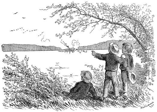 They sprang to their feet and hurried to the shore toward the town. They parted the bushes on the bank and peered out over the water. The little steam ferry-boat was about a mile below the village, drifting with the current. Her broad deck seemed crowded with people. There were a great many skiffs rowing about or floating with the stream in the neighborhood of the ferry-boat, but the boys could not determine what the men in them were doing. Presently a great jet of white smoke burst from the ferry-boat’s side, and as it expanded and rose in a lazy cloud, that same dull throb of sound was borne to the listeners again.