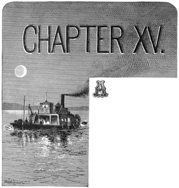 Presently the cracked bell tapped and a voice gave the order to “cast off.” A minute or two later the skiff’s head was standing high up, against the boat’s swell, and the voyage was begun. Tom felt happy in his success, for he knew it was the boat’s last trip for the night. At the end of a long twelve or fifteen minutes the wheels stopped, and Tom slipped overboard and swam ashore in the dusk, landing fifty yards down-stream, out of danger of possible stragglers.