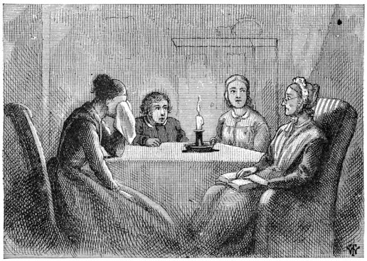 He flew along unfrequented alleys, and shortly found himself at his aunt’s back fence. He climbed over, approached the “ell,” and looked in at the sitting-room window, for a light was burning there. There sat Aunt Polly, Sid, Mary, and Joe Harper’s mother, grouped together, talking. They were by the bed, and the bed was between them and the door. Tom went to the door and began to softly lift the latch; then he pressed gently and the door yielded a crack; he continued pushing cautiously, and quaking every time it creaked, till he judged he might squeeze through on his knees; so he put his head through and began, warily.