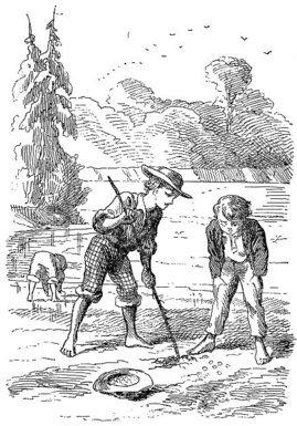 Next they got their marbles and played “knucks” and “ringtaw” and “keeps” till that amusement grew stale. Then Joe and Huck had another swim, but Tom would not venture, because he found that in kicking off his trousers he had kicked his string of rattlesnake rattles off his ankle, and he wondered how he had escaped cramp so long without the protection of this mysterious charm. He did not venture again until he had found it, and by that time the other boys were tired and ready to rest. They gradually wandered apart, dropped into the “dumps,” and fell to gazing longingly across the wide river to where the village lay drowsing in the sun. Tom found himself writing “Becky” in the sand with his big toe; he scratched it out, and was angry with himself for his weakness. But he wrote it again, nevertheless; he could not help it. He erased it once more and then took himself out of temptation by driving the other boys together and joining them.