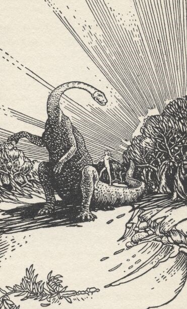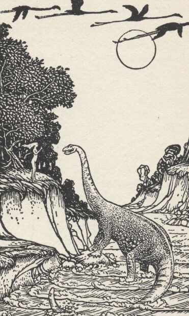 Still, her heart was set upon having that monster, and she couldn’t give it up. She thought we could start a dairy with it, and wanted me to help milk it; but I wouldn’t; it was too risky. The sex wasn’t right, and we hadn’t any ladder anyway. Then she wanted to ride it, and look at the scenery. Thirty or forty feet of its tail was lying on the ground, like a fallen tree, and she thought she could climb it, but she was mistaken; when she got to the steep place it was too slick and down she came, and would have hurt herself but for me.