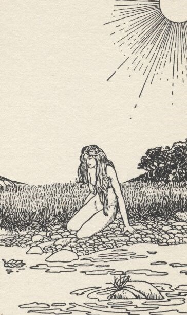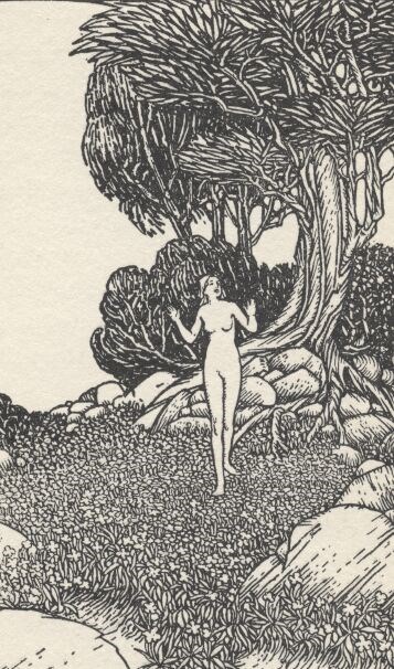 Perhaps I ought to remember that she is very young, a mere girl and make allowances. She is all interest, eagerness, vivacity, the world is to her a charm, a wonder, a mystery, a joy; she can’t speak for delight when she finds a new flower, she must pet it and caress it and smell it and talk to it, and pour out endearing names upon it. And she is color-mad: brown rocks, yellow sand, gray moss, green foliage, blue sky; the pearl of the dawn, the purple shadows on the mountains, the golden islands floating in crimson seas at sunset, the pallid moon sailing through the shredded cloud-rack, the star-jewels glittering in the wastes of space – none of them is of any practical value, so far as I can see, but because they have color and majesty, that is enough for her, and she loses her mind over them. If she could quiet down and keep still a couple minutes at a time, it would be a reposeful spectacle. In that case I think I could enjoy looking at her; indeed I am sure I could, for I am coming to realize that she is a quite remarkably comely creature – lithe, slender, trim, rounded, shapely, nimble, graceful; and once when she was standing marble-white and sun-drenched on a boulder, with her young head tilted back and her hand shading her eyes, watching the flight of a bird in the sky, I recognized that she was beautiful.