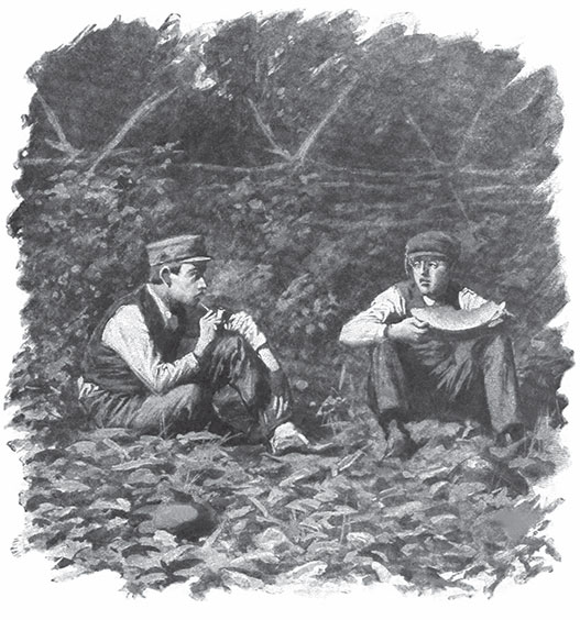 Тетя Салли принялась укладывать детей спать; это была долгая и скучная история, а потому мы с Томом совершили маленькую прогулку при лунном свете – отправились на огород, выбрали спелый арбуз и съели его, беседуя все время о том, что занимало наши мысли. Том высказал предположение, что во всех этих ссорах виноват Юпитер и что он, Том, при первом же случае постарается убедиться в этом; если окажется, что его предположение справедливо, тогда он заставит дядю Сайльса прогнать Юпитера.
