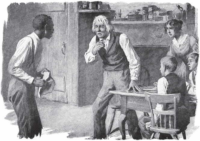 Вскоре после ужина пришел негр, постучал в дверь, просунул голову к нам в комнату и, держа в руке свою старую соломенную шляпу, стал неловко кланяться и топтаться на месте; наконец он объявил, что его послал сюда мастер Брэс за своим братом, которого он все время поджидал к ужину, и что он спрашивает у мастера Сайльса, не знает ли он, где его брат. Никогда не слыхал я у дяди Сайльса такого резкого и сурового тона, каким он ответил негру: