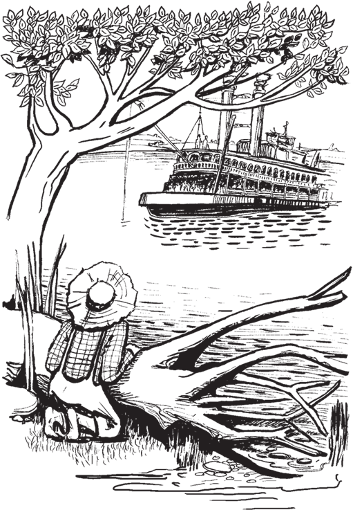 I lit a pipe and had a good long smoke, and went on watching. The ferryboat was floating with the current, and I allowed I’d have a chance to see who was aboard when she come along, because she would come in close, where the bread did. When she’d got pretty well along down towards me, I put out my pipe and went to where I fished out the bread, and laid down behind a log on the bank in a little open place. Where the log forked I could peep through.