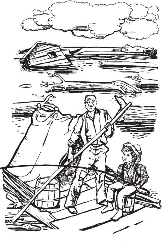 The fifth night below St. Louis we had a big storm after midnight, with a power of thunder and lightning, and the rain poured down in a solid sheet. We stayed in the wigwam and let the raft take care of itself. When the lightning glared out we could see a big straight river ahead, and high, rocky bluffs on both sides. By and by says I, “Hel-LO, Jim, looky yonder!” It was a steamboat that had killed herself on a rock. We was drifting straight down for her. The lightning showed her very distinct. She was leaning over, with part of her upper deck above water, and you could see every little chimbly-guy clean and clear, and a chair by the big bell, with an old slouch hat hanging on the back of it, when the flashes come.