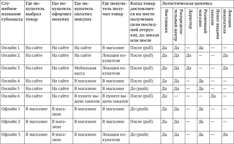ПРАВИЛА РАЗГРАНИЧЕНИЯ ТОРГОВЫХ КАНАЛОВПокупатель использует офлайн-канал, если он совершает покупку, находясь при этом внутри физического (офлайн) магазина. Под термином «совершает покупку» мы понимаем пробивание кассового чека и плату за товар, физически присутствующий в магазине, или оформление заказа/предзаказа (возможно, без оплаты) на товар, физически присутствующий в магазине (в ассортиментной матрице магазина) либо физически присутствующий в магазине в качестве образцов. Не имеет значения, когда, как и кем товар будет доставлен покупателю – заберет он его сам и сразу, оформит доставку из магазина либо товар будет доставлен ему из даркстора[101], распределительного центра и пр., торговым оператором или сторонним логистическим оператором.