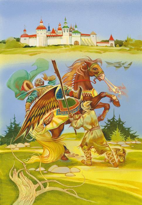 Вдруг видит Еким – скачет конь что лютый зверь, на нём в дорогом платье Тугарин сидит.