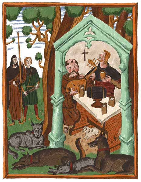 – Здравствуйте, молодцы! – сказал отец Тук, отирая со лба пот широким рукавом своей кожаной куртки. – Ради весёлой встречи первым долгом закон велит промочить горлышко кружкой доброго эля. В трёх полётах стрелы отсюда стоит моя скромная обитель. Олений бок, верно, ужарился в печи, если только не сгорел, пока мы с Робином тут разминали кости. Это, конечно, скромная трапеза для сорока молодцов! Но, клянусь святым Дунстаном, не всех оленей я перебил в королевских лесах.